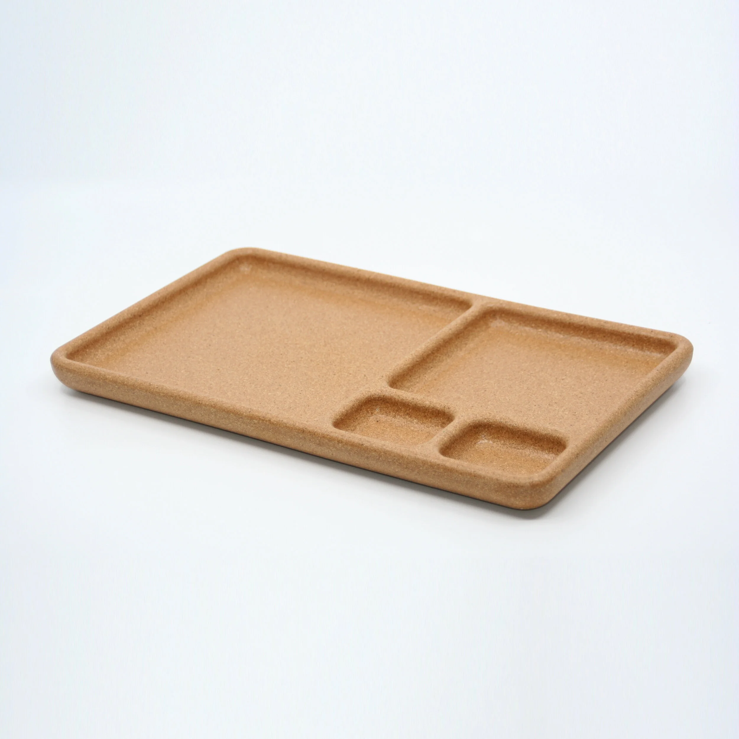 an organizer tray in agglomerated cork. inspired by the form of the salt-water ponds used to extract salt from seawater. ideal for the desk or sidetable. the various openings are sized for things such as phone, wallet, airpods, or a variety of other uses imagined by the user.